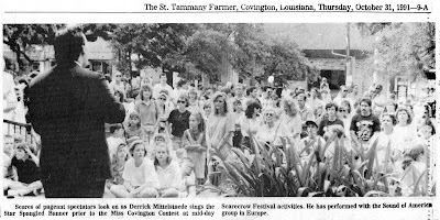 The Covington Old Town Festival started in 1983, featuring old fashioned arts and crafts, music, and a variety of artists. It ran for several years, then started to fade out. However, its most popular event, the Scarecrow Contest, took on a life of its own as the Scarecrow Festival, running for an additional few years. Here's a video of some of the Scarecrow Festival activities in the early 1990's.