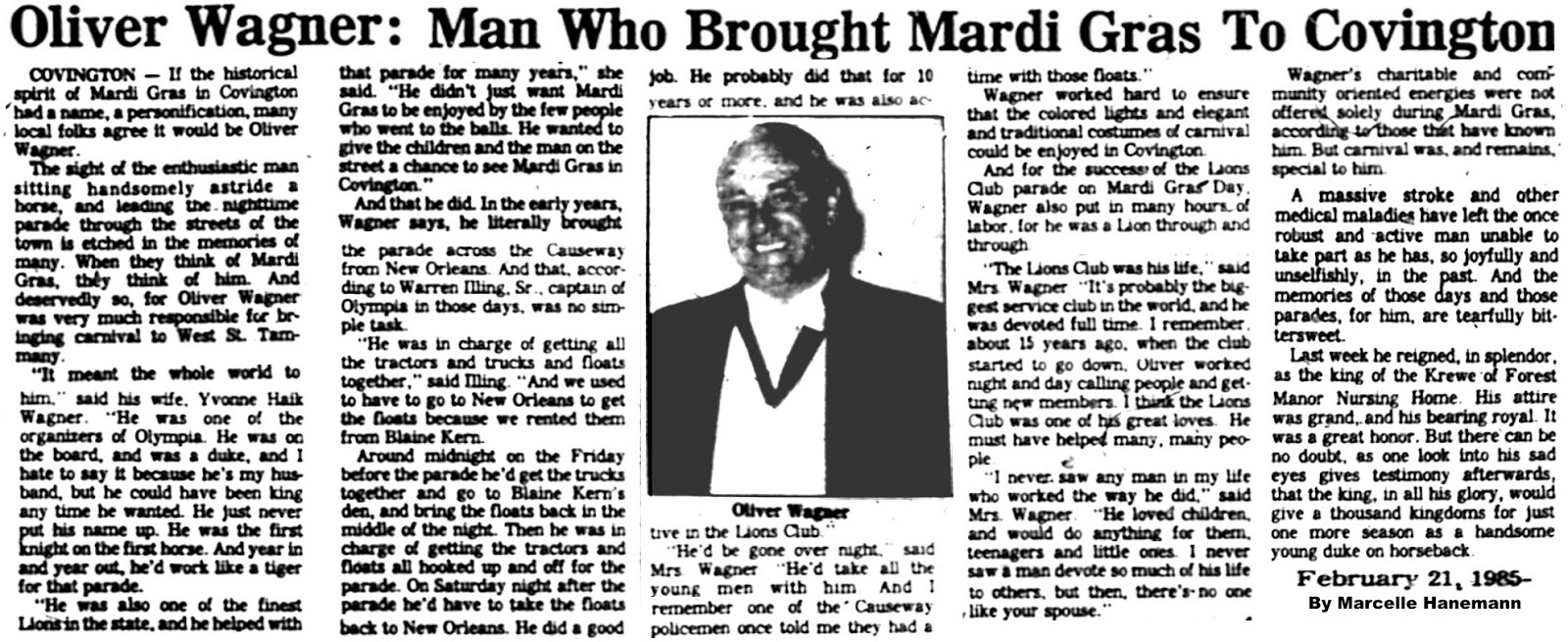 COVINGTON — If the historical spirit of Mardi Gras in Covington had a name, a personification, many local folks agree it would be Oliver Wagner.