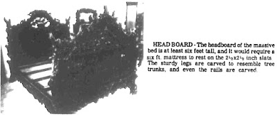 The massive teakwood bedroom set defies description. Although it rests among peerless antiques of Windhaven it nevertheless seems aloof and isolated in its unique splendor. Like a mighty monarch amid princlings, magnificent, marvelous and very, very mysterious.