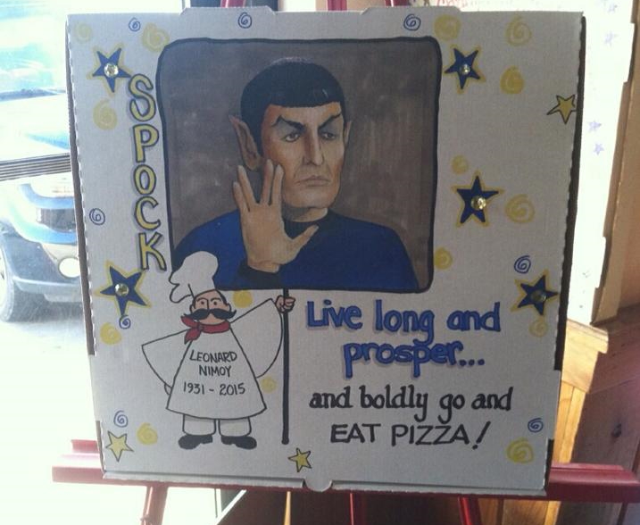 The dining room is lined with an array of pizza boxes, mounted high up on the wall, each one a masterpiece of artwork by Suzanne King. The pizza boxes are, well, just different than anything else, and Dustin is proud of them.