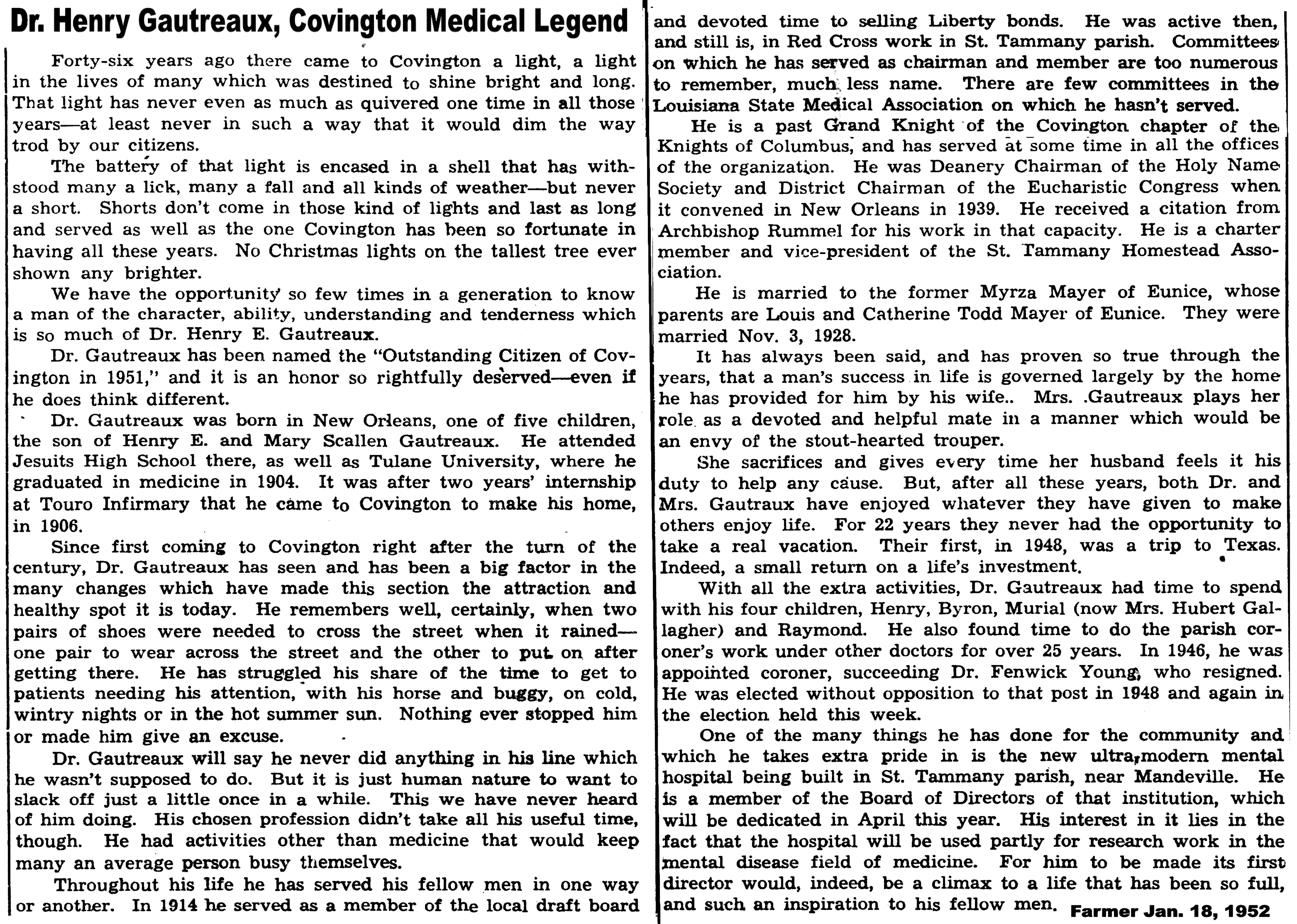 The incredible story of Dr. Gautreaux was told in this extensive article in a 1952 edition of the St. Tammany Farmer.