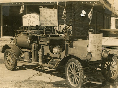 For more than 150 years, our emergence into a type of so-designated modernization was slow, first as a fourbourg, then a village, then an incorporated town. In 1918, the Hon. H. B. Pruden, one of our early settlers and a generous far-seeing progressive and home loving citizen, donated free of all cost to the Mandeville Volunteer Fire Department a modern chemical fire engine, supplanting the "bucket brigade' unit.