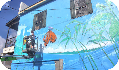 Among those she thanked for their assistance in the mural were Todd Hillberry with Hydro-Line Exterior for providing the services to clean the wall prior to the project, and Jim Montour of PPG paints for his generosity in supplies for wall prep and paint. She rents the cherry-picker lift from A-Rental Depot of Slidell, who is working to accomodate her schedule at a good price. Thanks also went to Maggy Case-Eymard of the Art Association for all of her effort in making progress happen. "I am incredibly grateful to Maggy, Janie, and Adair for their help in priming the wall," the artist added.